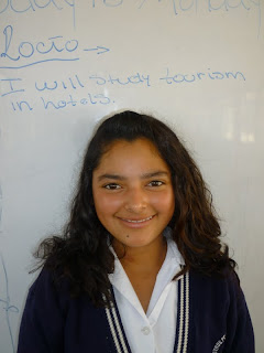 These past two weeks I’ve been covering the future tense with my Tercero Básico class (ya know – I will, you are going to, etc.) and I think the kids are really enjoying it…mostly because it’s easy…but also because I’ve been doing a lot of fun activities (today we read each other’s fortunes while wearing a ridiculous costume and using our “Crystal Ball” (aka an upside down Tupperware…)) and also lots of exercises to get them thinking about their own futures. On Monday for homework I told them to go home and write the 10 biggest goals that they have for their lives. On Tuesday in class, they shared their goals with one another. It was really amazing to see the aspirations that they have and want to accomplish – they have some big dreams :). Today in class I asked each of my students to pick their most important goal in life and write it on the board. I then took pictures of each of them to be given to them when they graduate from Básico. (I wish I could take credit for this AWESOME idea (and the crystal ball one for that matter) – but it all goes to Molly – you’re the best Mol!) Below are just some of the incredible, wonderful, and amazing dreams that my kids have for their futures :).